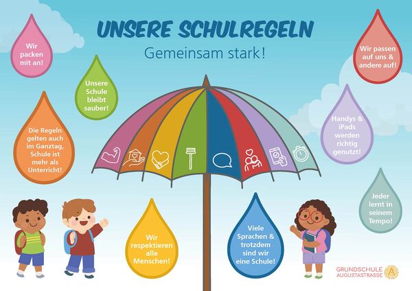 In der Grundschule Augustastraße legen wir großen Wert auf ein respektvolles und harmonisches Miteinander zwischen dem Schulteam, Eltern und Kindern. Unsere Schul- und Klassenregeln sind ein wesentlicher Bestandteil dieses Miteinanders, sodass jedes Kind die Möglichkeit hat, sich zu entfalten und zu lernen. Sie helfen dabei, eine positive Lernumgebung zu schaffen, in der sich alle Schülerinnen und Schüler sicher, respektiert und motiviert fühlen.