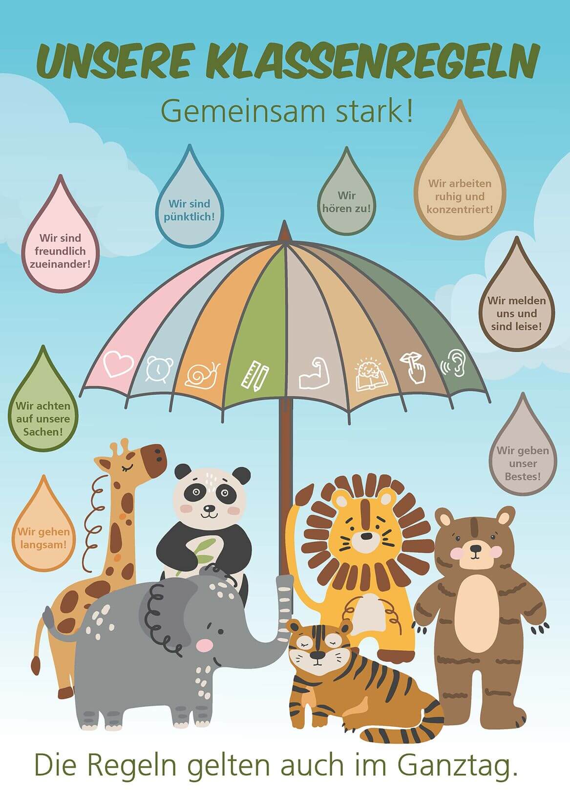 Die Regeln orientieren sich an unseren gemeinsamen Werten: Respekt, Verantwortung und Fairness. Uns ist es wichtig, dass wir unsere Rolle als Vorbild wahrnehmen und gemeinsam unsere Regeln und Werte leben. Mit den Kindern werden die Regeln in regelmäßigen Klassenstunden besprochen, sodass jedes Kind ein klares Verständnis dafür entwickeln kann, was von ihm erwartet wird und wie es zu einer positiven Atmosphäre in der Klasse beitragen kann.